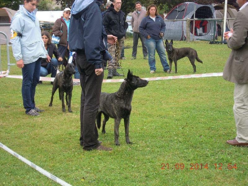 Ensemble féminin, d'un bon gabarit et d'un bon format, DCC, jolie tête avec belle expression, belle ossature, Exc aplombs et angulation, Très jolie fourrure bringée, allures juvéniles qui a besoin d'être discipliné